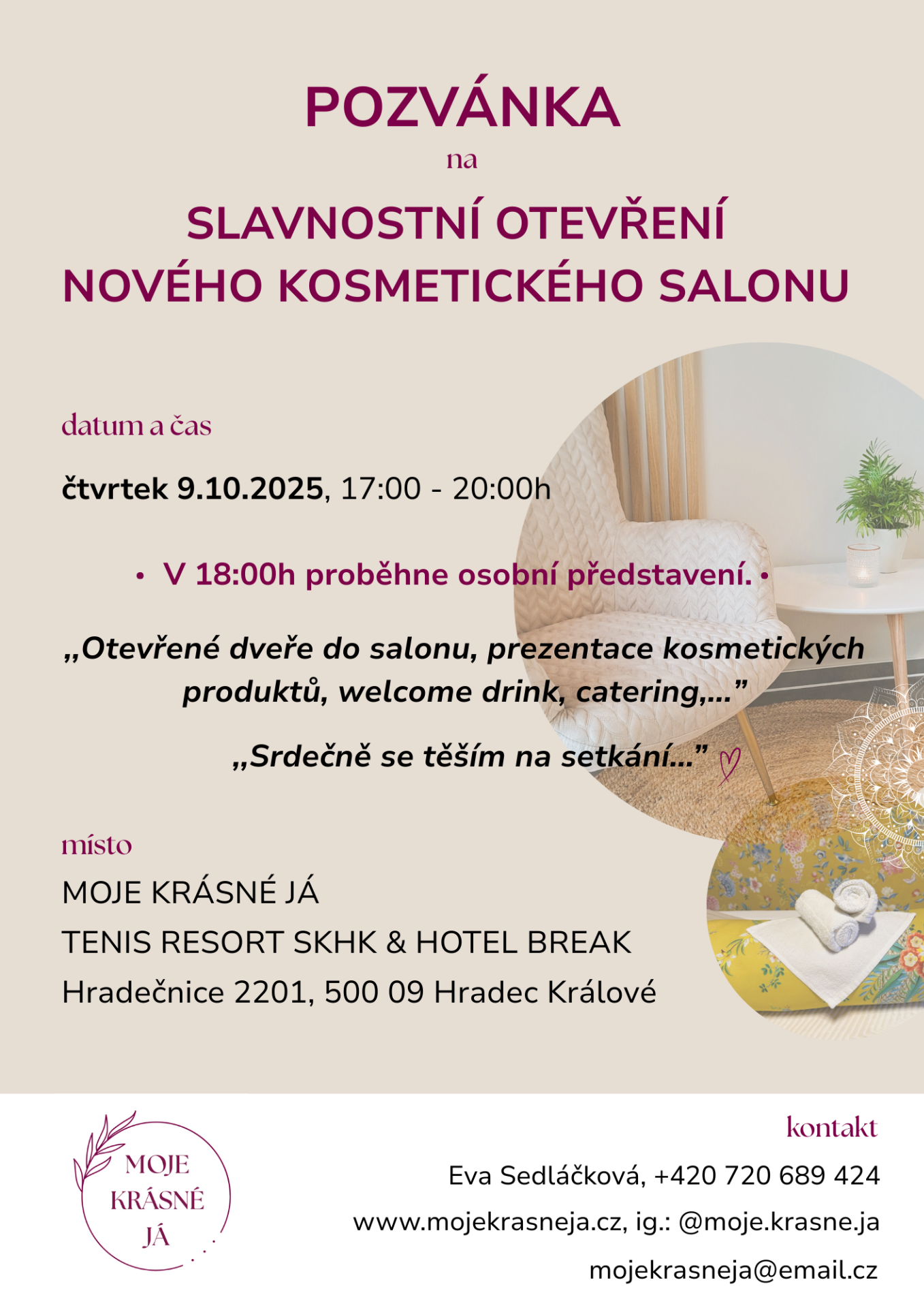Dne 9.10.2025 proběhlo slavnostní otevření NOVÉHO KOSMETICKÉHO SALONU v Hradci Králové, na adrese Hradečnice 2201, 500 09 Hradec Králové.